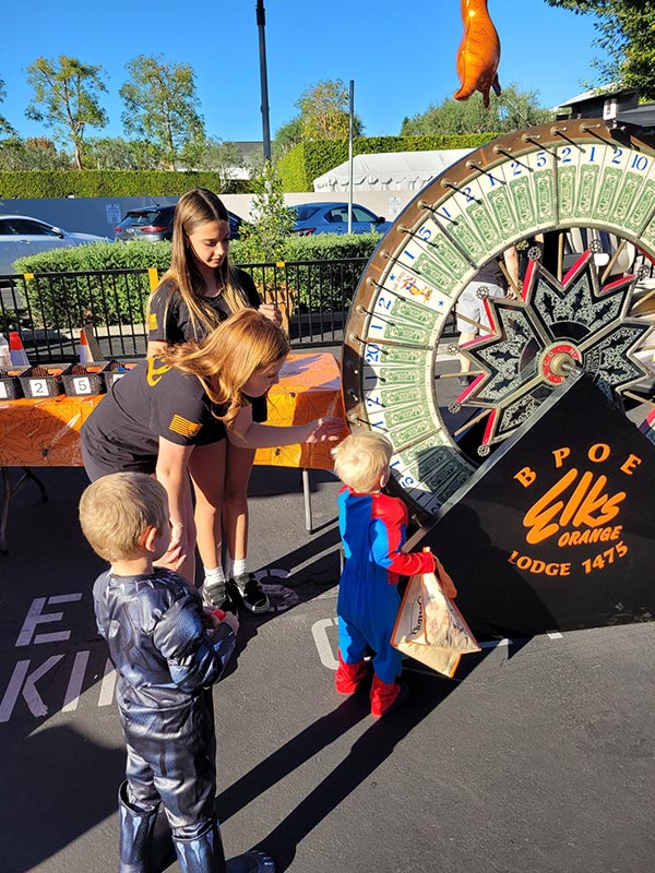 Antlers Brook (bending over) and Bailey helped kids spin the wheel to win a prize.