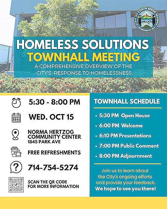 COSTA MESA...A City Council Town Hall will take place on Oct. 15, 2025, from 5:30 p.m. to 8 p.m. at the Norma Hertzog Community Center to discuss how the City is tackling homelessness and the issues surrounding it.