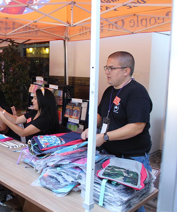 Matthew Gates is handing out backpacks and school supplies